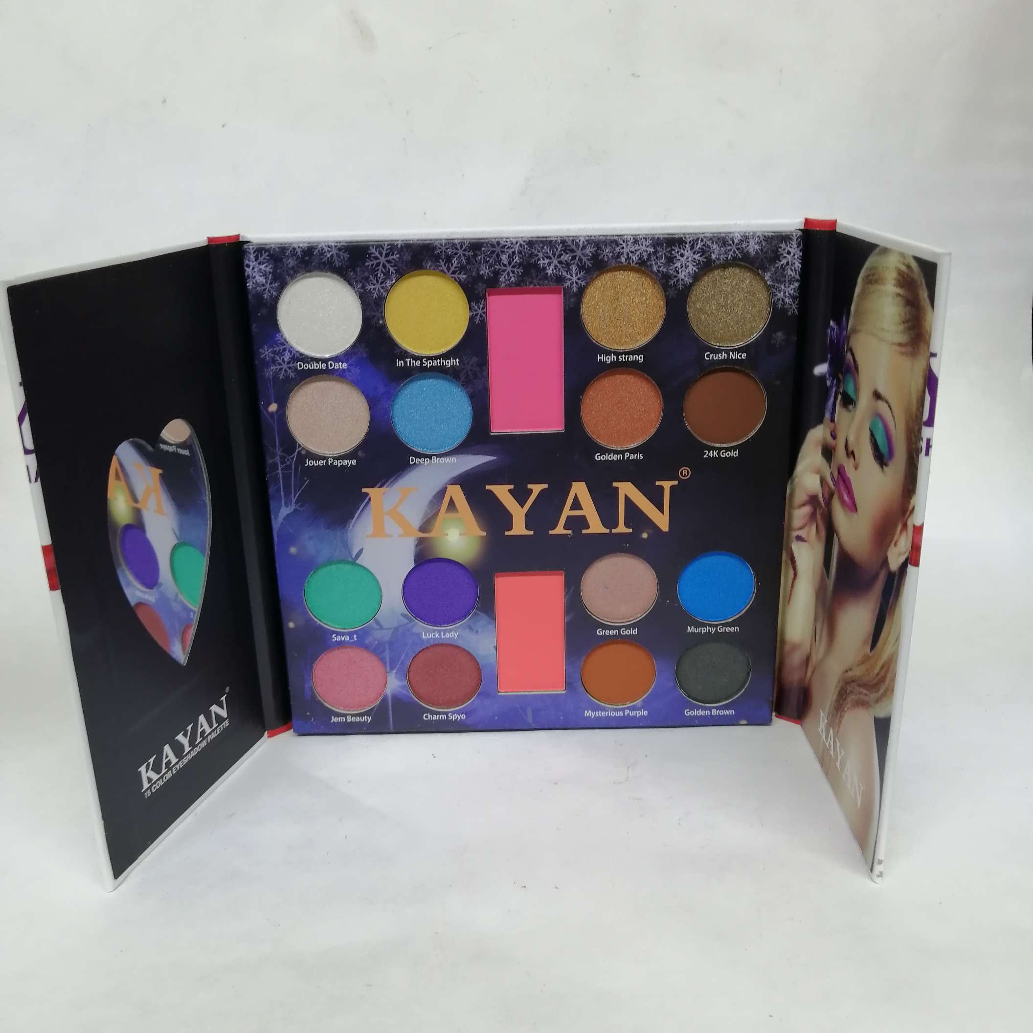 Paleta de sombras Kayan con 18 colores.